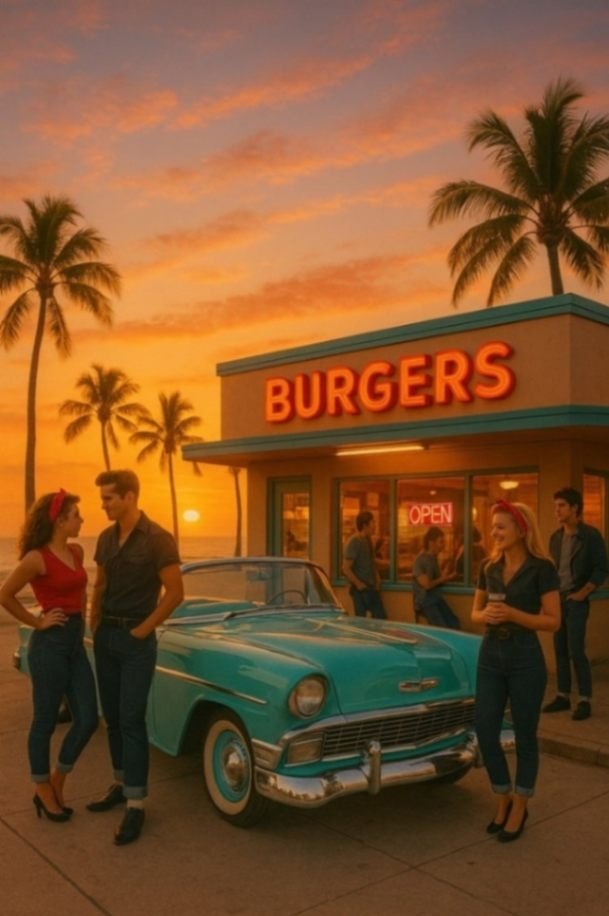 El rockabilly siempre ha tenido un fuerte vínculo con la cultura americana de los años cincuenta: diners, carreteras infinitas, coches clásicos, heladerías con neón y hamburgueserías donde sonaba Elvis o Carl Perkins en la máquina de discos.